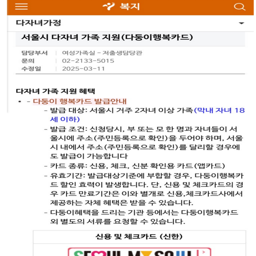 서울시 다둥이 행복카드는 매년 혜택이 달라지고, 제휴처가 변경될 수 있습니다.