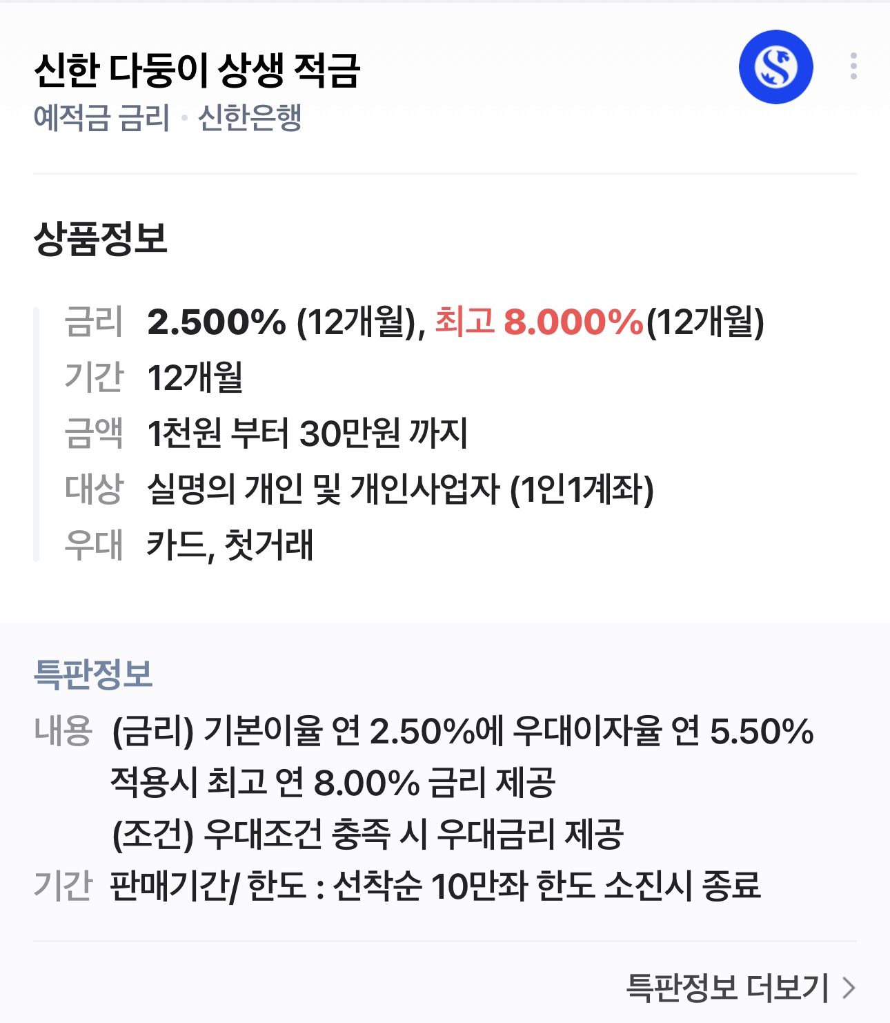 - 신한 다둥이 상생적금: 자녀 수·다둥이카드 등 조건 따라 최대 8%
